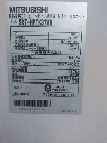 安曇野市穂高 三菱電機自然冷媒CO2ヒートポンプ給湯機 貯湯タンクユニットSRT-HPTK37W5→コロナ自然冷媒CO2家庭用ヒートポンプ給湯機ヒートポンプユニットCHP-DZ451K、貯湯ユニットCTU-37AZ1K エコキュート交換工事