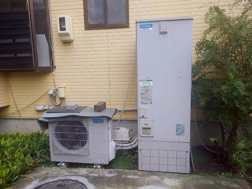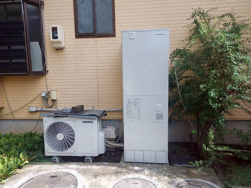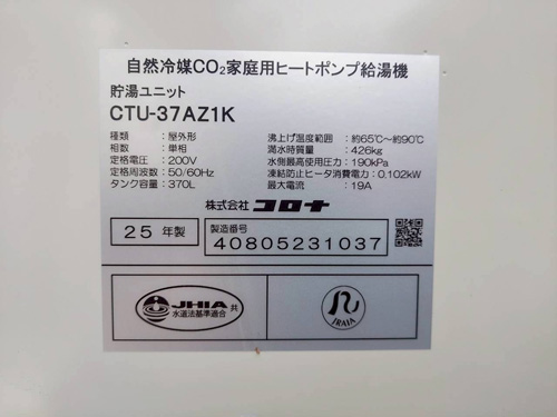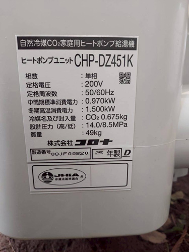 安曇野市穂高 コロナ自然冷媒CO2家庭用ヒートポンプ給湯機ヒートポンプユニットCHP-DZ451K、貯湯ユニットCTU-37AZ1K エコキュート交換工事